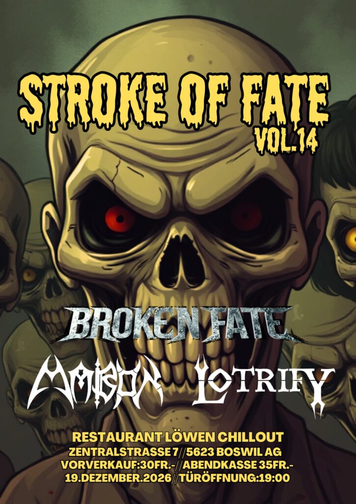 Mit dabei sind unsere Freunde von MABON, die mit ihrer Mischung aus Thrash und Death Metal die Stage richtig zum Glühen bringen, und LOTRIFY aus Baden, die mit ihrem modernen Metal-Style ordentlich einheizen werden!!!!!